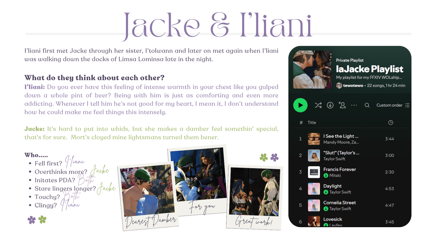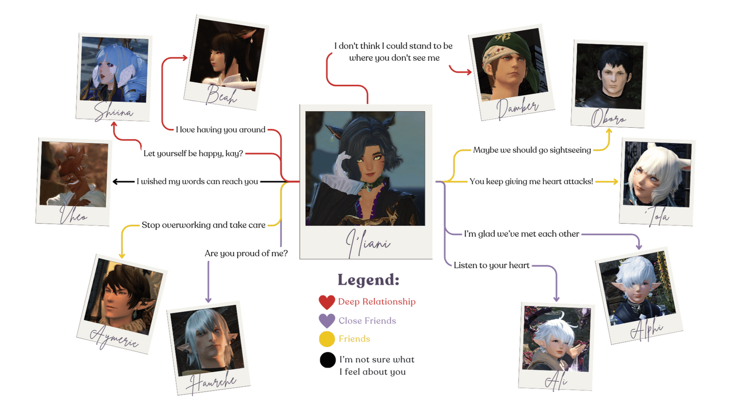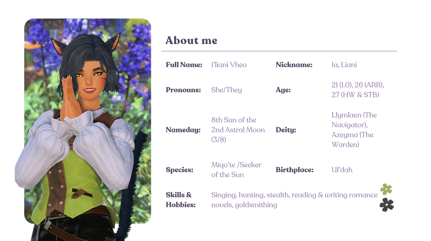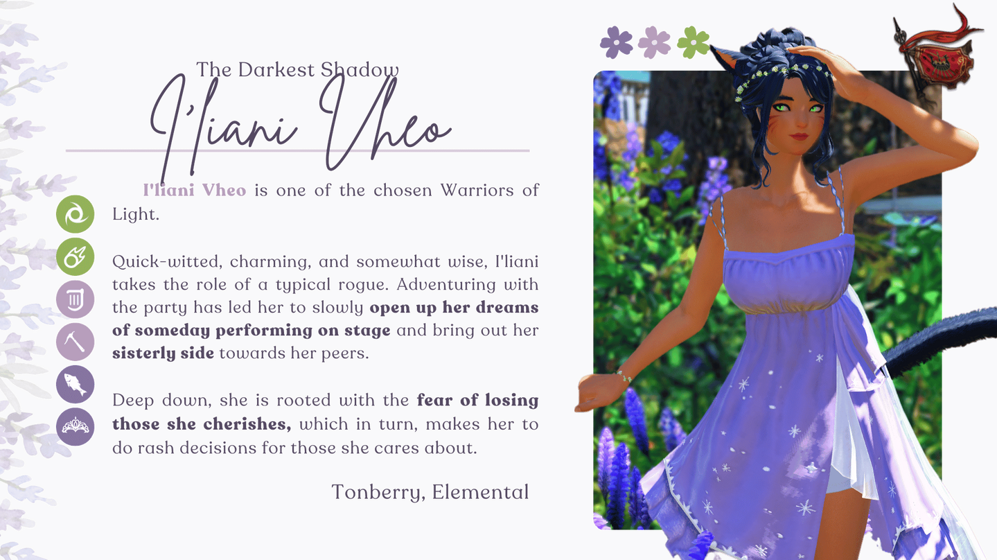 I'liani has heard many things about Limsa Lominsa, a place of freedom and riches—something she hopes to have one day as a musical theater actress. It is also the place her mother was last seen, as written in a letter that was sent to her father.So, she started training with the bow, gradually learning how to use it and helping with hunting. She was agile and adapted easily to situations, yet her eyes constantly misinterpreted distances, much to her dismay.Her love for romance novels only strengthened as well, leading her to try out different relationships with different people and races. Many end as casual flings, which led I'liani to feel disappointed as to not be able to find the 'one'.
