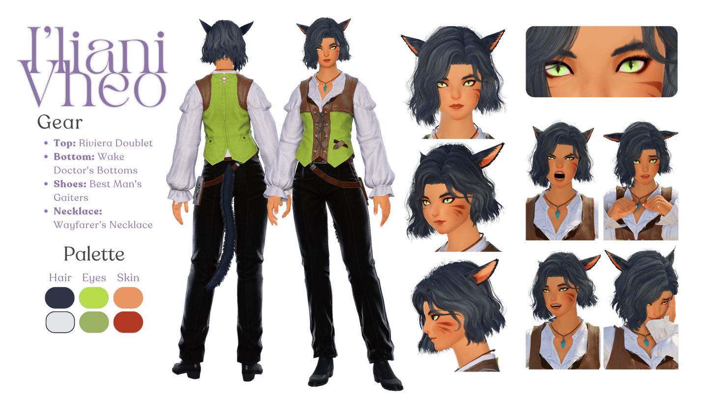 I'liani has heard many things about Limsa Lominsa, a place of freedom and riches—something she hopes to have one day as a musical theater actress. It is also the place her mother was last seen, as written in a letter that was sent to her father.So, she started training with the bow, gradually learning how to use it and helping with hunting. She was agile and adapted easily to situations, yet her eyes constantly misinterpreted distances, much to her dismay.Her love for romance novels only strengthened as well, leading her to try out different relationships with different people and races. Many end as casual flings, which led I'liani to feel disappointed as to not be able to find the 'one'.